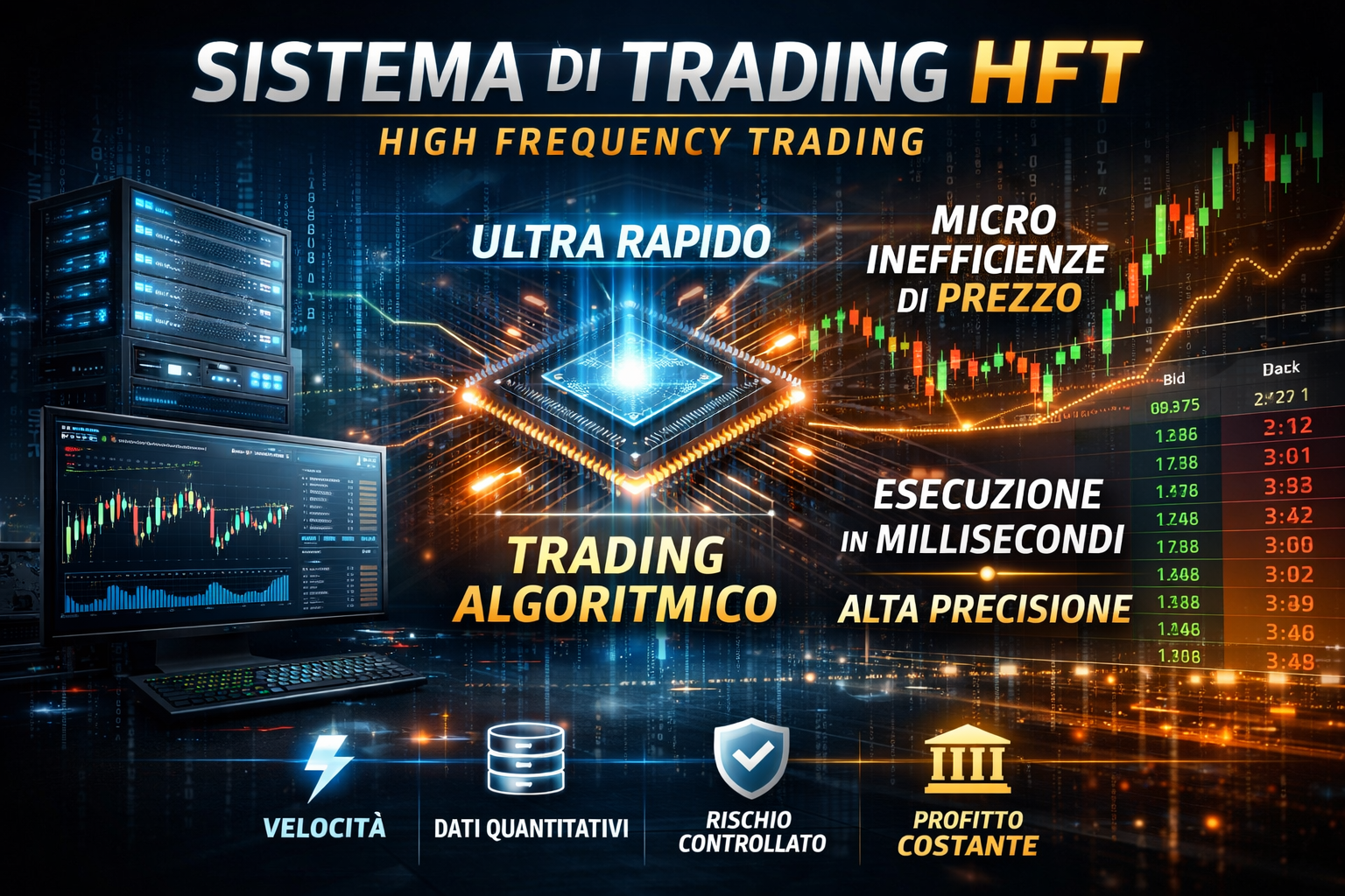 High Frequency Trading, Sistema HFT, Trading automatico, Trading algoritmico, Bot di trading professionale, Software di trading automatico, EA MT4 MT5, Trading quantitativo, Prop firm trading, Funded account trading, Trading ad alta frequenza, Latency trading, Scalping automatico, HFT forex, HFT trading system